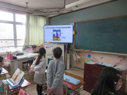10日は立腰チェックデーでした。「姿勢体操をします・・・」子どもたちは映像を見ながらストレッチをしています。「あああ!体が伸びて気持ちいい!」「普段猫背なんやな・・・」と,普段の姿勢について考えるきっかけになりました。