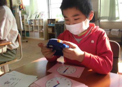 時計カードを見て,模擬時計をその時刻に合わせます。