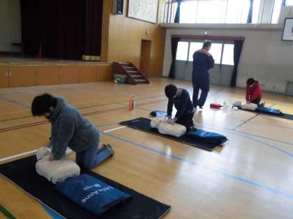 からだ健康月間の取り組みの一つとして救命救急講習を受けました。伏見消防署の方に来ていただき,胸骨圧迫のやり方やAEDの使い方を教えていただきました。初めてのことに最初はおそるおそるやっていた子どもたちでしたが,アドバイスを受けながらやってみるうちにだんだん上手になっていきました。一人ひとりでの体験の後は,グループでの実践練習をしました。実際に人が倒れている現場に遭遇したらどのように動いたらよいかを考え,グループで実践しました。119番に連絡する人,AEDを取りに行く人,胸骨圧迫をする人など役割を考えて動くことができました。使う場面がないのが一番ですが,もしもの場合には今日学んだことを生かし,率先して動くことができるといいですね。