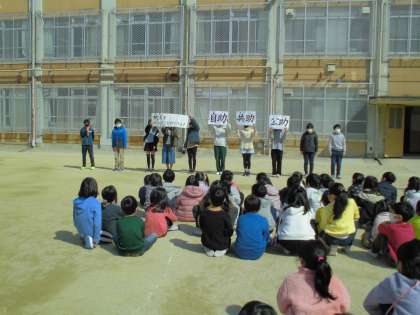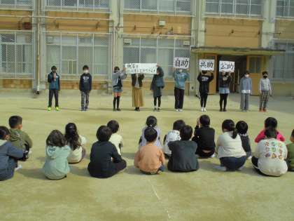 3月9日と10日に1・2年生の避難訓練がありました。二次避難を運動場にした低学年の友だちに6年生が,防災についての話をしました。全校の友だちに少しでも防災意識をもってもらうために,「災害を減らすことはできなきけれど,被害を減らすことはできる」と伝えそのために,真剣に避難訓練に取り組むことの大切さを話してくれました。