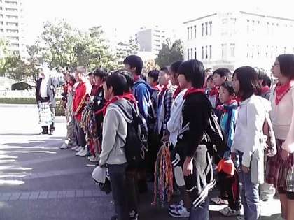 広島に着き,広島平和記念公園で「平和集会」を行いました。その後,資料館内を班行動で見学しています。