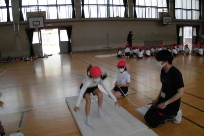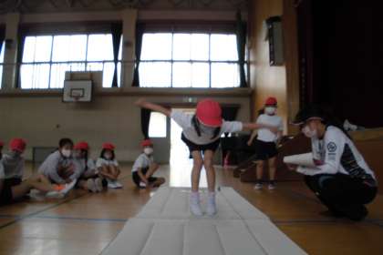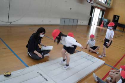 ひざを曲げて,腕を振り切って遠くに跳ぶことをがんばりました。