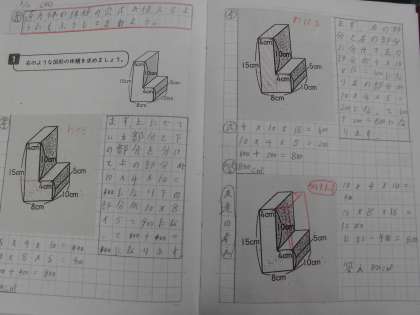 体積の学習です。直方体や立方体の体積を求める公式を使って,くふうして体積を求めました。