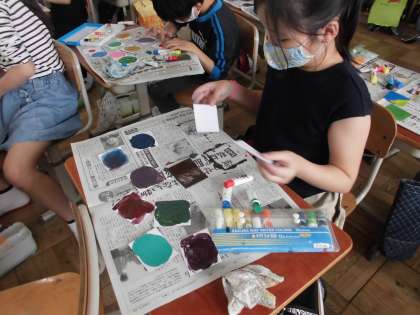 0517 4年 「色合い ひびきあい」 公開日 2022/05/17 更新日 2022/05/17 4年生 絵の具を少しずつ白い画用紙に出して,水を足したり混ぜ合わせたりして,いろいろな色の組み合わせの面白さをたくさん発見しました。 自分が作った色カードでお気に入りを見つけたり,友達の色の不思議さを味わったりして鑑賞をしました。