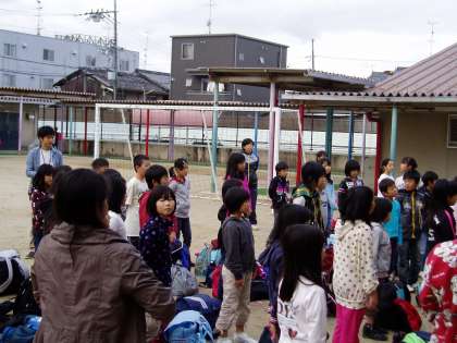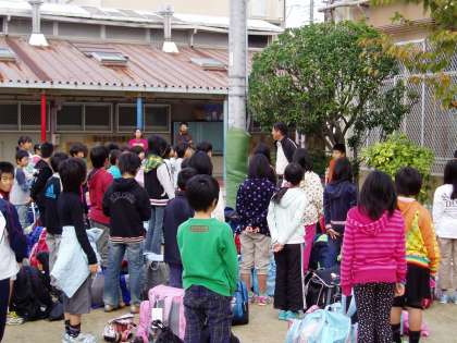 本日より2泊3日で,4年生が「みさきの家」での野外活動に出発しました。欠席も無く,全員元気に参加できました。写真は,出発式の様子です。