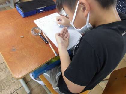 虫眼鏡を使ってツルレイシのたねの観察をしました。