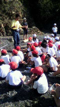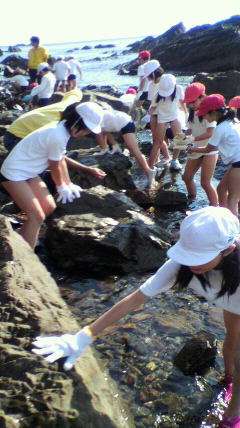 全員で宮崎浜に出かけています。マリンランドの職員さんから満潮や干潮のお話を聞き,ヤドカリやナマコなど色々な生き物に出会っているようです。