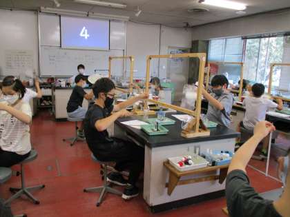 科学センター学習へ行きました。3クラスに分かれて実験をしました。1クラスは様々な種類のお茶を実験しながら見分けていきました。その後,お茶に含まれているカテキンとカフェインについて調べました。あとの2クラスは液体Xの正体を探るべく冷やしたり温めたりする実験をしました。調べた結果,液体Xはエタノールだということが分かり,後半はエタノールについて詳しく学んでいきました。