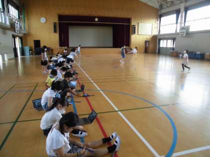今日は体育館で実験です。前回車を走らせて遊んだ経験から,ゴムを短くのばした時,長くのばした時どれほどの距離を車が走るのか予想しました。