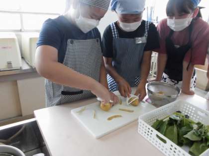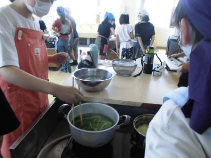 グループで協力しながら,青菜のおひたしとゆでいもを上手に調理することができました。自分たちで調理したおひたしとゆでいもをおいしくいただきました。