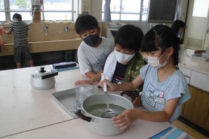 0715 ☆2年生☆ かさ 公開日 2022/07/15 更新日 2022/07/15 2年生 かさの学習で、 LやdL、mLの量感をつかむために、 家庭科室へ行き、なべややかんなどに水を入れ、どれくらい入っているかを はかりました。 1Lぴったりがどのくらいかなども考えて活動しました。