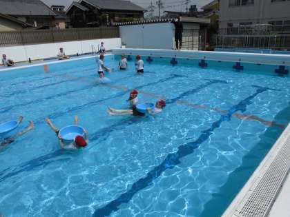 今回の学習では水に落ちた時には、とにかく「浮いて待つ」ことが大切であるということを学びました。衣服の中に空気を入れて浮いたり、ペットボトルやたらいなどを使って浮いたりする練習をしました。また、落ちた人を助けようと水に入り事故に遭うというケースもあります。そんな時のために、水に入らず岸からロープや棒を使って助ける方法についても知ることができました。子どもたちは初めての体験にとまどいながらも一生懸命浮く練習をしたり、もしもの時にはどうしたらよいかということを考えたりすることができました。