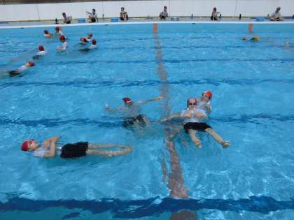 水着の上に体育の服を着用し、水の中に入りました。ただ歩くだけでも水着の時とは違い大変動きにくそうでした。水からあがる時にも「重い。」「うまくあがれへん。」などの声があがりました。衣服のまま水に落ちると思うように身動きがとれないことを体験しました。いつも練習している泳ぎ方もできず、「手をあげるのが辛い。」などと苦労している様子でした。