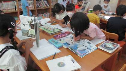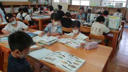 図鑑や本で初めて知ったことを伝える活動を「鳥になったきょうりゅうの話」で学習しました。子どもたちの中から自分たちも伝えたいという声が出てきました。それぞれが興味のある動物や昆虫,植物・・・などの図鑑を読んでいます。これから2学期初めにかけて話をする機会がとれたらと考えています。