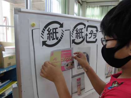 また、表示を見ながら、ごみを『燃やすごみ』と『資源ごみ』に分別したり、「必要なものだけを買って、ごみになるようなものを買わないようにしよう。」などと、ごみを減らしていくために自分たちにできることを考えたりしました。