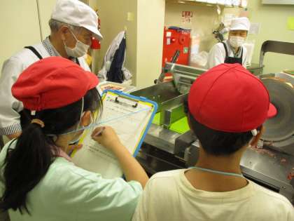 また、バックヤードでは、お肉を切る機械やお惣菜を作る工程などを間近で見ることができ、次々と質問もしていました。