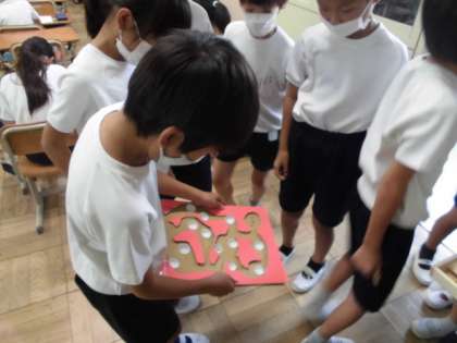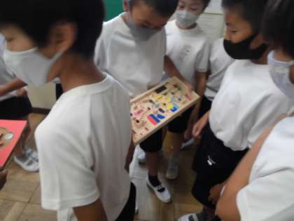 夏休みの間にがんばって作ってきた自由研究の工作や習字,調べ学習などをみんなで見たり,遊ばせてもらったりして楽しんでいます。