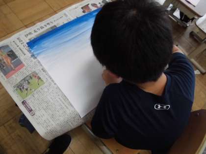 2年生の図工では,物語を聞いて想像した場面を描いています。まず初めに絵の具を使って背景をグラデーションにして仕上げました。水を少しずつ足しながら色を変化させて塗っていきます。完成が楽しみです!