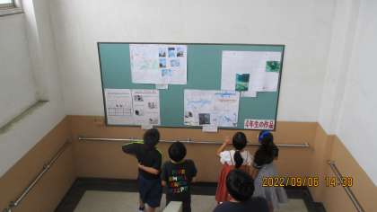 0906 4年生 階段の踊り場にて 公開日 2022/09/06 更新日 2022/09/06 4年生 南校舎の2階から3階への階段の踊り場に夏休みの子ども達の取組を掲示しています。 今日も、通りかかった子どもたちが興味津々で見ていました。