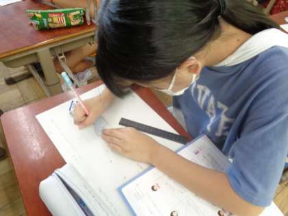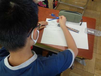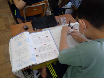 3つの辺が分かっていたらかけるね,1つの辺と両端の角がわかってたらできる・・・と教え合いながらがんばっています。