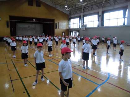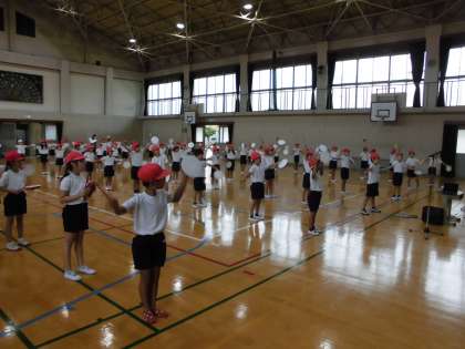 体育フェスティバルへ向けて,ダンスの練習を始めました。2年生が躍るのはエイサーです。小学校に入って初めてのダンス,今日は冒頭の部分を練習しました。上手にそろえられるかなとドキドキしていましたが,みんな一生懸命動きをまねて,とってもきれいにそろっていました!