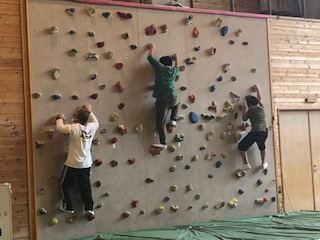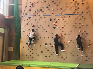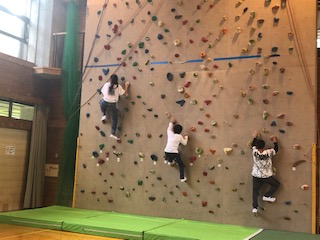 2つ目の活動、5年生は予定していた冒険の森が雨の影響で滑りやすくなっているので,ボルダリングに変更になりました。