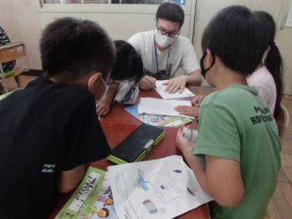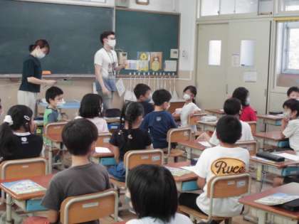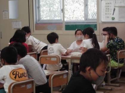 ALTのデロン先生との学習です。前もって用意していた自己紹介のカードを見ながら自分の名前,好きな物や嫌いな物などを積極的に伝えることができました。