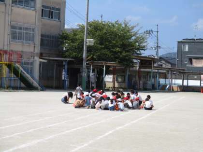 運動場で遊んでいた子どもたちは、運動場の真ん中に集まってしゃがむ。
