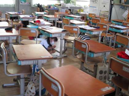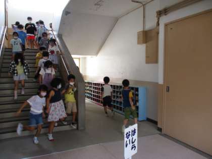 廊下にいる子どもたちは、窓ガラスから離れて頭を守って低い姿勢。