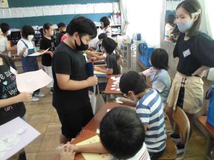 文房具カードを手渡すお店屋さんとお客さんの二グループに分かれて行いました。