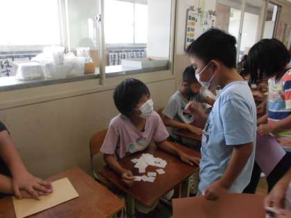 オリジナルの文房具セットを作ろうというめあてのもと、身近な文房具とほしい数を言って文房具カードを受け取るやりとりを楽しみました。