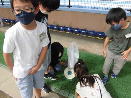 重さの学習をしています。今日は袋に砂を入れてはかりに乗せ、1kgを作りました。