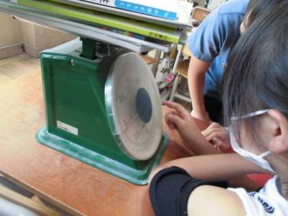 今日は、一人ひとりが量ってみたい物の重さを予想して、どの「はかり」を使えばいいかも考えて実際に量る学習をしました。