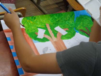 下絵もかき終わり、今は丁寧に彩色しています。雰囲気がでるように、どんな感じをだしたいか考えながら、工夫しながら色をぬっています。