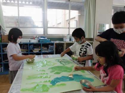 黄緑色、緑色、少し白色や青色を混ぜたりして、色の重なりを楽しみながら、模造紙いっぱいに色をぬりました。