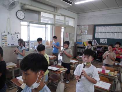 スタッカートに気を付けて、リコーダー演奏をしました。リコーダーをもつ姿勢や指使いに気を付けて、演奏することができるようになってきました。
