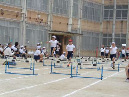 2つ目の種目「ハードル走」です。自分たちで設定したインターバルのハードルを飛びました。インターバルのカードを示し,自分たちですばやくハードルを動かして取り組むことができました。「とぶ」ではなく「またぐ」を意識して,上手に飛べていたと思います!