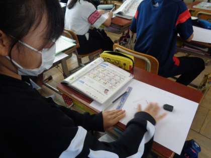 canやcan'tを使ってそれぞれができることできないことについてやり取りをしました。その後、友達ができることやできないことを伝えるカードを作っています。次の時間に紹介し合います。