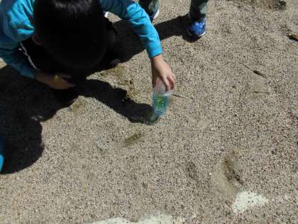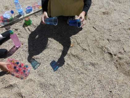 今日は天気が良かったので,光のプレゼントで作った作品を外で太陽に透かしてみました。お友達と協力して作品を重ねて透かしてみたり,水を入れて光の映り方が変わる様子を見たりと光の様々な姿を楽しんでいました。