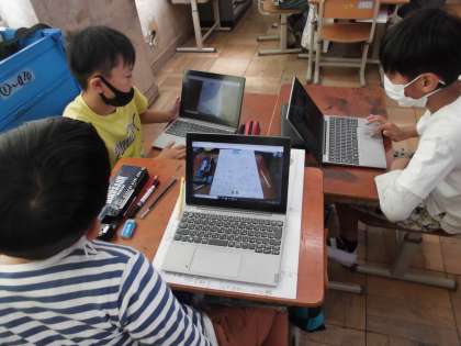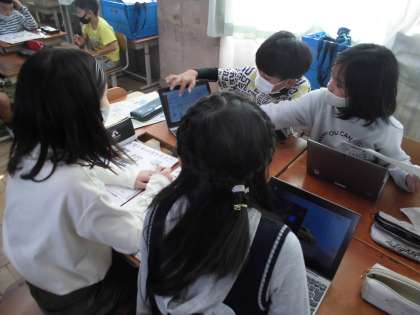 グループごとに調べてきた環境問題について、チラシやポスターにかいています。校内の人に知ってもらいたい内容を相談しながら、絵や文を考えています。他のグループが作成しているポスターをタブレットで共有し、ポスターやチラシを見た人がどのようなことが伝わるのかを話し合いました。自分たちのグループに取り入れたいことを見つけ、チラシやポスターの完成を目指しています。仕上がるのが楽しみです。