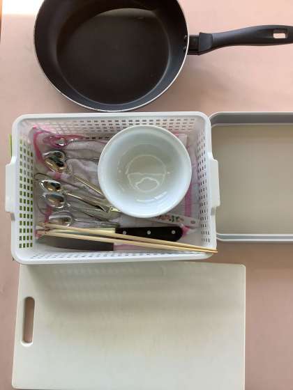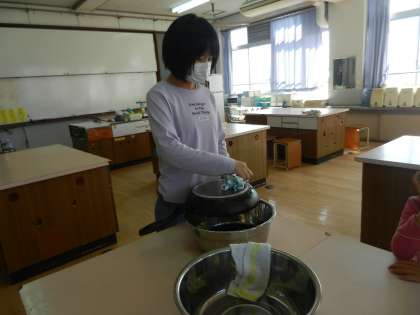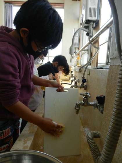 『家庭科室』グループは、フライパン・バット・まないた・包丁・お皿など、必要な用具を洗い、机の上に準備しました。