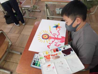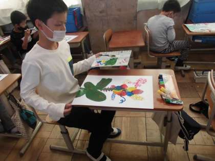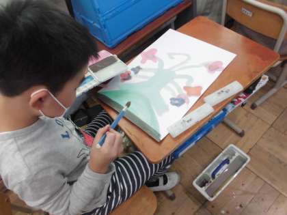絵の具の濃さや筆の太さをうまく組み合わせながら、どんどん想像を膨らませて、「まだみたことのない花」を咲かせていきました。想像して描いてく花がどれも個性的で素敵な作品ができました。