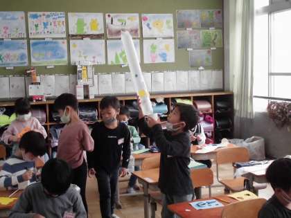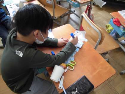 1027 1年生 図工 公開日 2022/10/27 更新日 2022/10/27 1年生 「にょきにょきとびだせ」 袋がふくらむ仕組みを使って、おもちゃを作っています。 空気が抜けないように仕組みを作るのにテープの貼り方などを工夫しました。 飾り付けも、画用紙を貼ったり、ペンで塗ったりおもいおもいに作っていました。