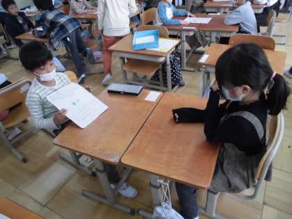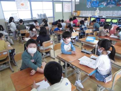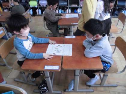 1031 1年生 生活科「あきといっしょに」 公開日 2022/10/31 更新日 2022/10/31 1年生 先週、淀城公園に秋見つけに行って見つけたことを、ひとりひとりがカードに書きました。今日は、自分が見つけたことを友達と交流しました。友達の発表を聞くことで、自分は見付けなかったものや、気付かなかったことが分かりました。 聞く人の方にカードを向けながら話すことも少しずつ上手になってきました。