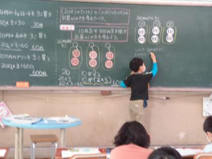 「1けたをかけるかけ算の筆算」の単元に入りました。 今日は、何十・何百のかけ算の考え方を学習しました。