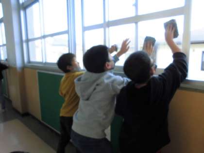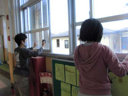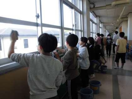 普段なかなかできない窓掃除ですが、5・6年生で取り組むとあっという間です。北校舎2階廊下がすっかり明るくなりました。