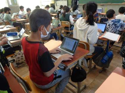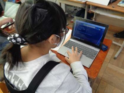 総合的な学習の時間です。2組は、先週職場体験に行きました。今日は、インタビューしたり体験したことから感じた「働くうえで大切なこと」を整理しました。ロイロノートに、自分の考えや気付きをまとめています。