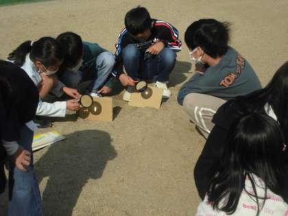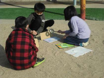 「太陽の光」今日は、虫眼鏡をつかって、太陽の光を集めました。約束をしっかり守って実験をしています。段ボールの表面から煙が出てきたことですごく温度が高くなっていることが分かりました。