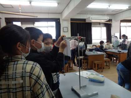1114 5年生 理科 公開日 2022/11/14 更新日 2022/11/14 5年生 理科の学習です。「ふりこの動き」の単元です。おもりの重さとふりこの1往復する時間の関係を予想し、実験し、調べました。グループのみんなで協力しながら取り組んでいます。
