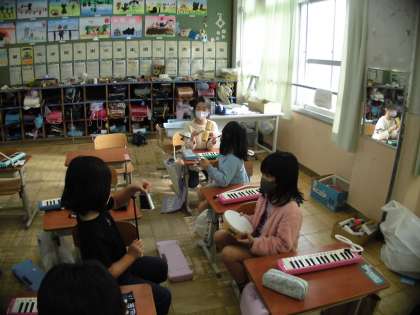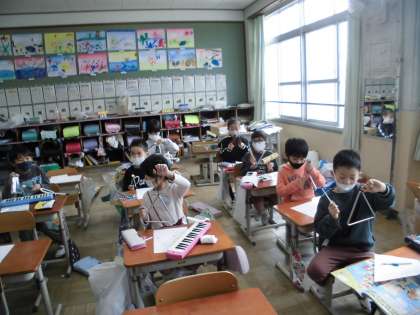 1115 2年生 音楽 公開日 2022/11/15 更新日 2022/11/15 2年生 「ウッドブロック」「クラベス」「カウベル」など、 普段触れることが少ない打楽器を使って、リズム打ちをする学習をしています。 4つのリズムの中から、楽器ごとに合うリズムを選び、 友達と楽器でお話しをしています。 いろいろな楽器の音を確かめながら、楽しく学習を進めています。